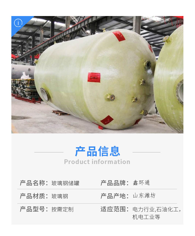 山東環(huán)通復合材料有限公司成立于2011年,是從事玻璃鋼儲罐產品的企業(yè),公司位于山東濰坊安丘市。玻璃鋼儲罐分為:立式儲罐和臥式儲罐,有1立方、2立方3立方、4立方、5立方、10立方、12立方、15立方、20立方、25立方、30立方、50立方等,顏色分為:綠色、藍色、黃色等。公司產品主要分為:玻璃鋼儲罐容器,玻璃鋼化糞池,玻璃鋼隔油池,玻璃鋼加砂管道,玻璃鋼脫硫塔,玻璃鋼格柵,玻璃鋼防腐,玻璃鋼儲罐,玻璃鋼管件等。