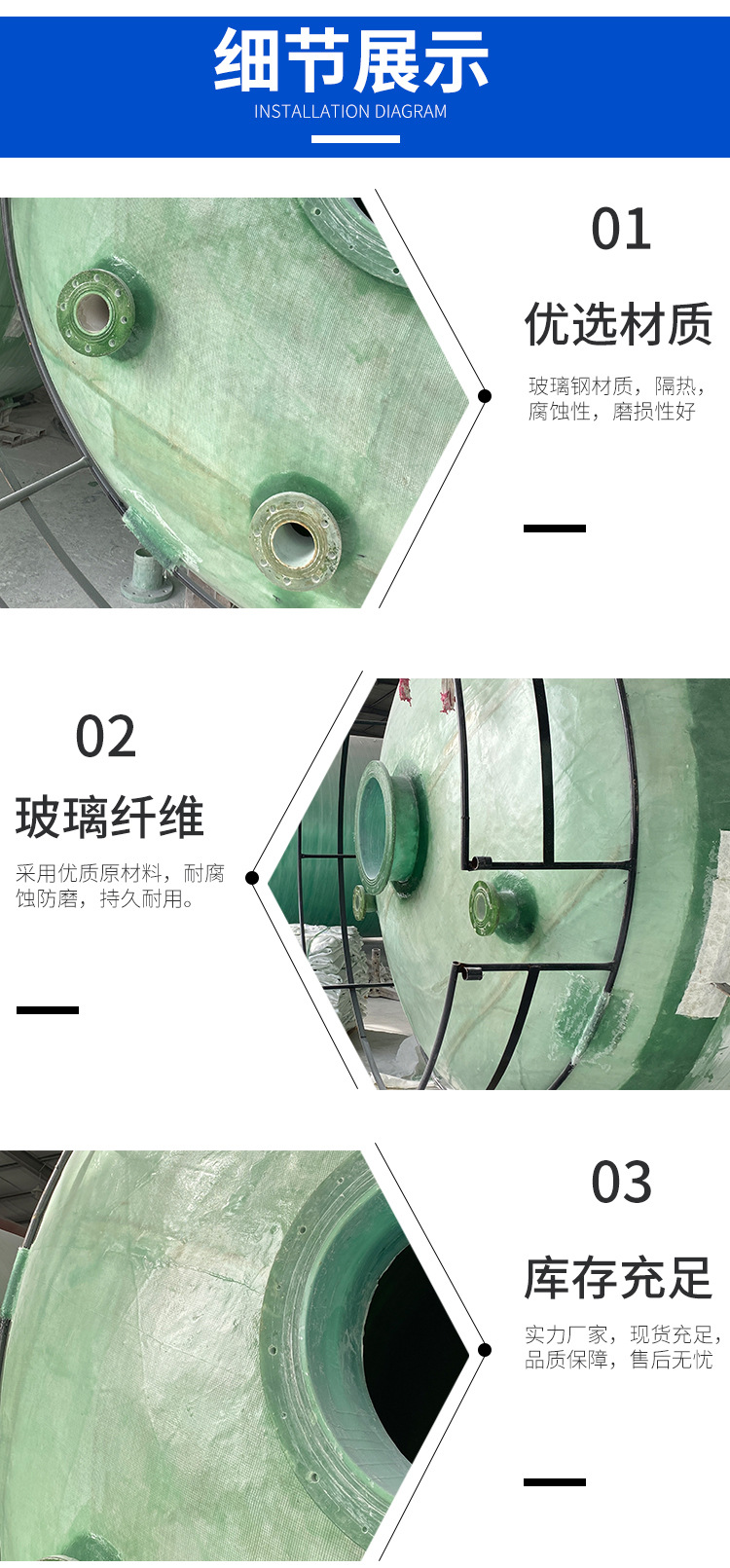 山東環通復合材料有限公司成立于2011年,是從事玻璃鋼儲罐產品的企業,公司位于山東濰坊安丘市。玻璃鋼儲罐分為:立式儲罐和臥式儲罐,有1立方、2立方3立方、4立方、5立方、10立方、12立方、15立方、20立方、25立方、30立方、50立方等,顏色分為:綠色、藍色、黃色等。公司產品主要分為:玻璃鋼儲罐容器,玻璃鋼化糞池,玻璃鋼隔油池,玻璃鋼加砂管道,玻璃鋼脫硫塔,玻璃鋼格柵,玻璃鋼防腐,玻璃鋼儲罐,玻璃鋼管件等。